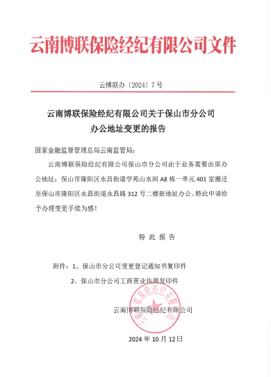 云南博聯(lián)保險經(jīng)紀有限公司關(guān)于保山市分公司辦公地址變更的報告