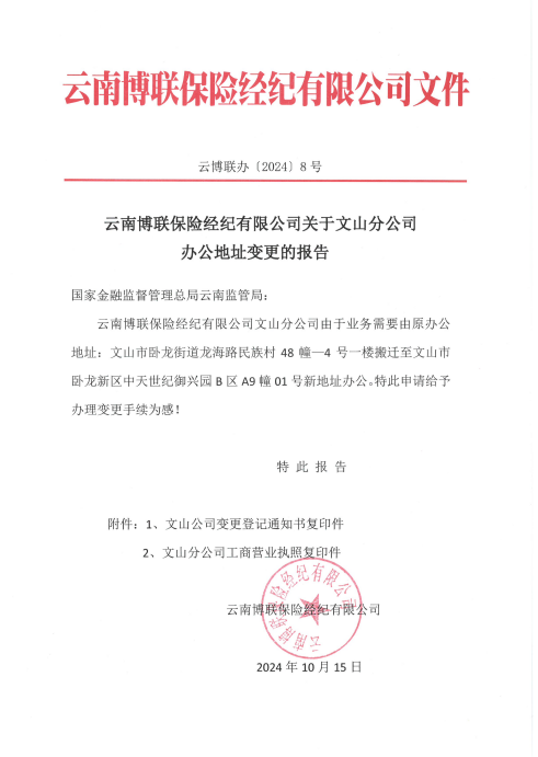 云南博聯(lián)保險(xiǎn)經(jīng)紀(jì)有限公司關(guān)于文山分公司辦公地址變更的報(bào)告